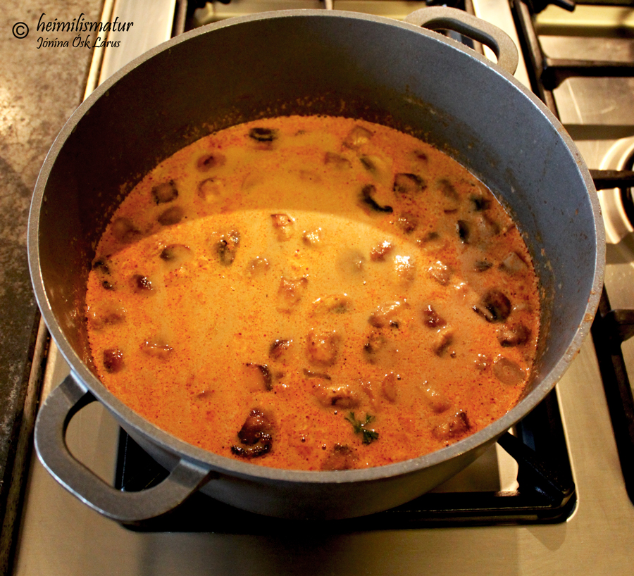 Pipar og aromati bætt útí, svo sveppir. Koniak næst og humarinn síðast. Ég set humarinn í heita súpuna og tek pottinn strax af hellunni