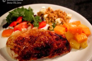 Ofnbakaður kjúklingur með gljáa og steiktum sætum kartöflum með ananas og chilli.