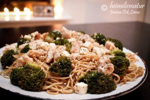 Núðlur með kjúkling og soðnu brokkolí