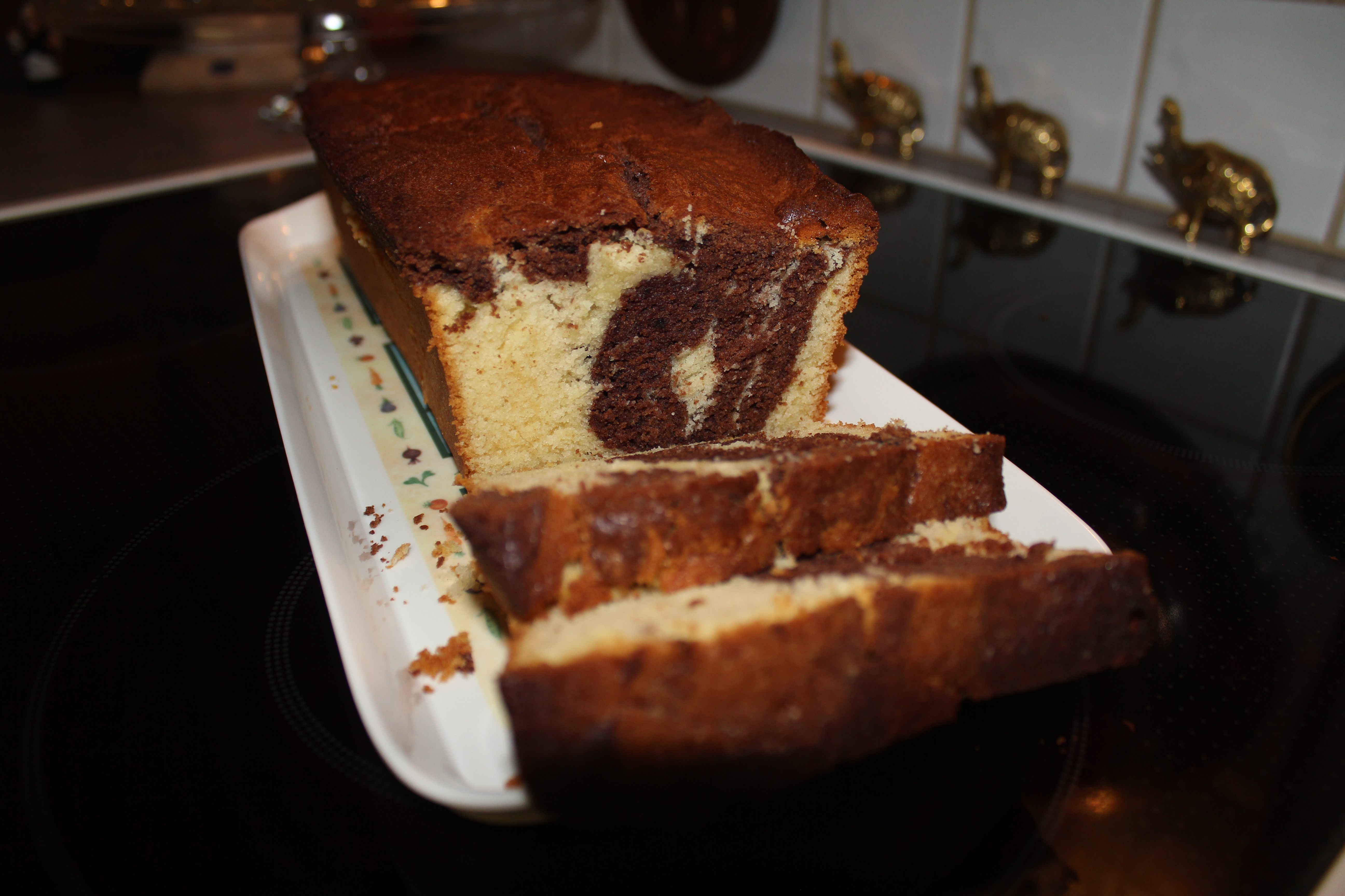 Því næst setjum við ljósa deigið í formið og síðan það dökka þar ofan á. Notum hníf og drögum deigið til í forminum, þannig að deigið blandast skemmtilega saman.